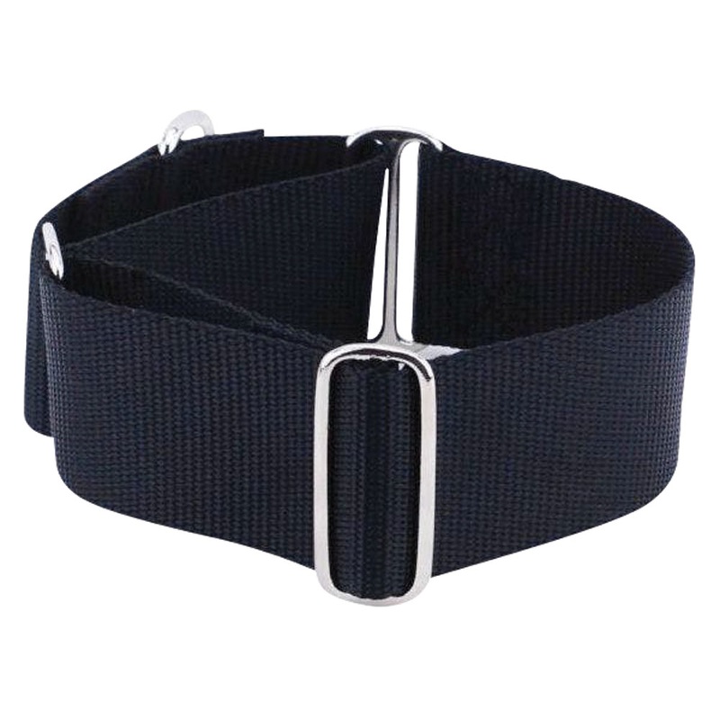 This solid color premium nylon collar is 2 inches in width. The stainless steel hardware will never rust or corrode, and the webbing is strong enough to tow cars! It will not break or fray, no matter how hard your dog pulls. Adjusts from 16-20 inches. Prou