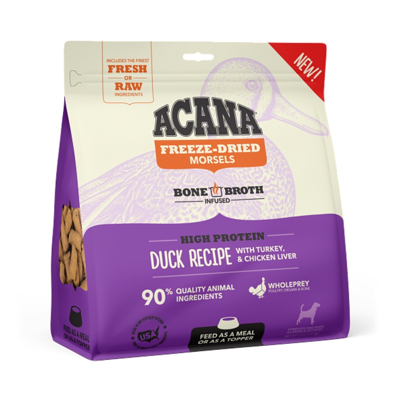 PRICE VALID FOR INSTORE PICKUP ONLYWe're obsessed with every ingredient that goes into ACANA Freeze-Dried Morsels dog food in our Free-Run Duck Recipe. That's why this freeze-dried dog food is crafted with 90% raw animal ingredients plus hearty bone broth