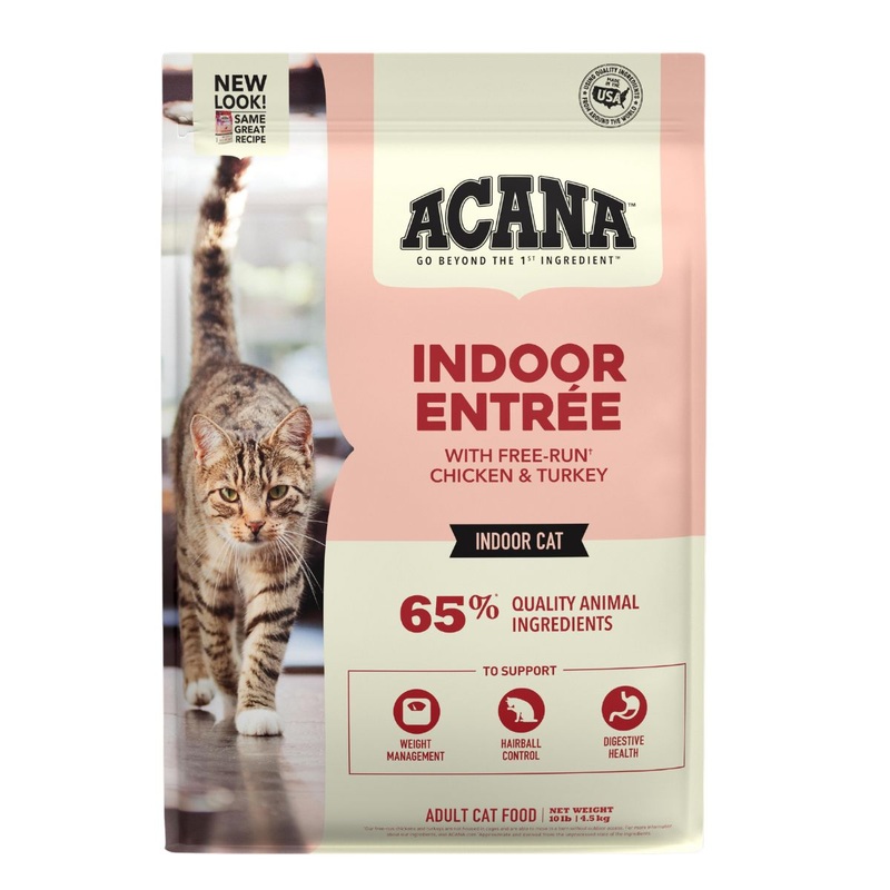 Feed your little wildcat a diet packed with quality animal ingredients. ACANAs new Indoor Entre recipe is brimming with free-run chicken and turkey, and tender, delicious rabbit to nourish your cat completely and deliver nutrients naturally. With a savory flavor, ACANA Indoor Entre has the nutrients your indoor cat needs with a taste that theyll love.