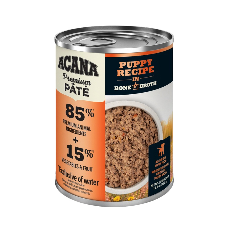 Bring home the quality nutrition your puppy needs to thrive with ACANA Premium Pate Puppy Recipe in Bone Broth Wet Dog Food. This high protein, grain free* dog food is made for puppies to nurture your puppy’s growth and development. Protein-rich chicken, turkey and herring are balanced with visible fruits and vegetables with a savory bone broth base for flavor and nutrition. This wet puppy dog food is 85 percent** animal ingredients and 15 percent*** fruits, vegetables and nutrients. Even better, this puppy food is high in moisture to help keep your pet hydrated. Choose ACANA dog food to give your companion the nutritional foundation they need to live a happy, healthy life. *Produced in a facility that also processes grains**Approximate and derived from the unprocessed state of the ingredients ***We also add vitamins, minerals, natural preservatives, flavors and probiotics One (1) 12.8 oz can of ACANA Premium Pate Puppy Recipe in Bone Broth Wet Dog Food Grain free* wet dog food recipe features chicken, turkey and herring and is balanced to include 85 percent** animal ingredients and 15 percent*** visible fruits, vegetables and nutrients ACANA wet dog food for puppies includes savory bone broth to add flavor and nutrition High moisture content in this puppy dog food helps keep your dog hydrated Premium dog food made in the USA with quality ingredients from around the world