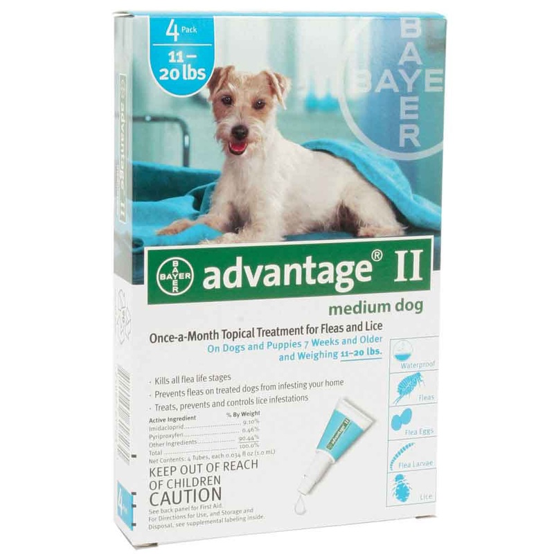 Advantage II is waterproof and lasts up to one month. Only suitable for dogs and puppies 7 weeks or older, weighing 11-21 lb. A non-detergent-based shampoo is recommended when bathing your dog during treatment.