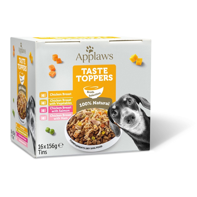100% Natural ingredients – high protein Ingredients that your pet will love. Suitable for all adult and senior dog breeds High protein chicken selection recipe for active or athletic dogs and seniors. Wet dog food toppers in broth is perfect on its own or mix with any dry dog food for a complete and balanced diet No artificial colours, flavours or preservatives. Use as a dry dog food topper for added flavour and hydration Pack contains – 16 x 156g Tins of Chicken Broth Selection. Chicken, Chicken with Vegetables, Chicken with Salmon, Chicken with Ham Sustainable, recyclable packaging, our metal tins and cardboard packaging can be fully recycled