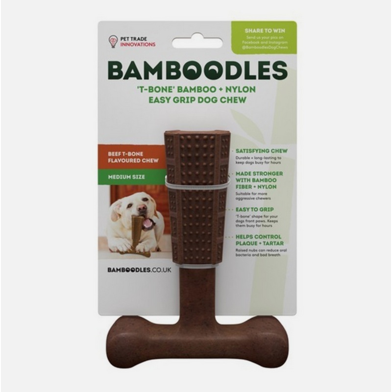 Bamboodles T-Bone shaped chew toys are infused with bamboo making them durable and a challenge for even the most aggressive of chewers.
