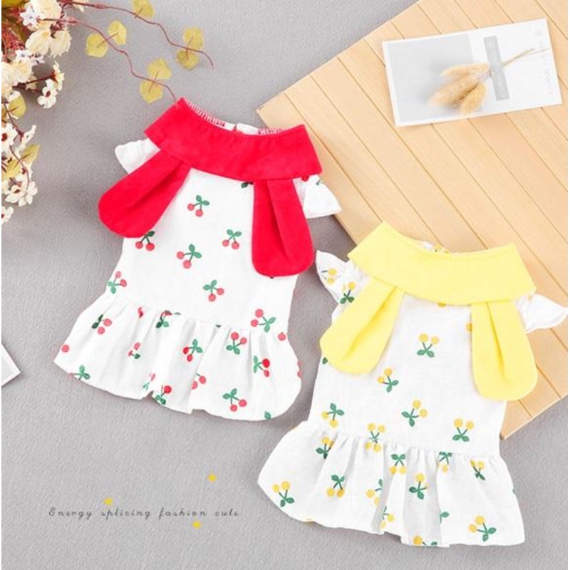 Beautifuldress withcherry design.Size XXS 6" BACKSize XS 8" BACKSize S-10" BACKSize -M-12" BACKSize -L-14" BACKSize XL- 15/16" BACKMake sure you measure your pet before purchase! We are specialised for small to medium breeds only! If you need size advise p