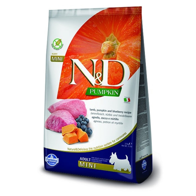 LAMB & BLUEBERRY ADULT MINIFarmina N&D Pumpkin Lamb & Blueberry Recipe is formulated to meet the nutritional levels established by the AAFCO Dog Food Nutrient Profiles for all life stages.INGREDIENTSFresh grass fed Lamb (22%), dehydrated lamb meat (20%), p