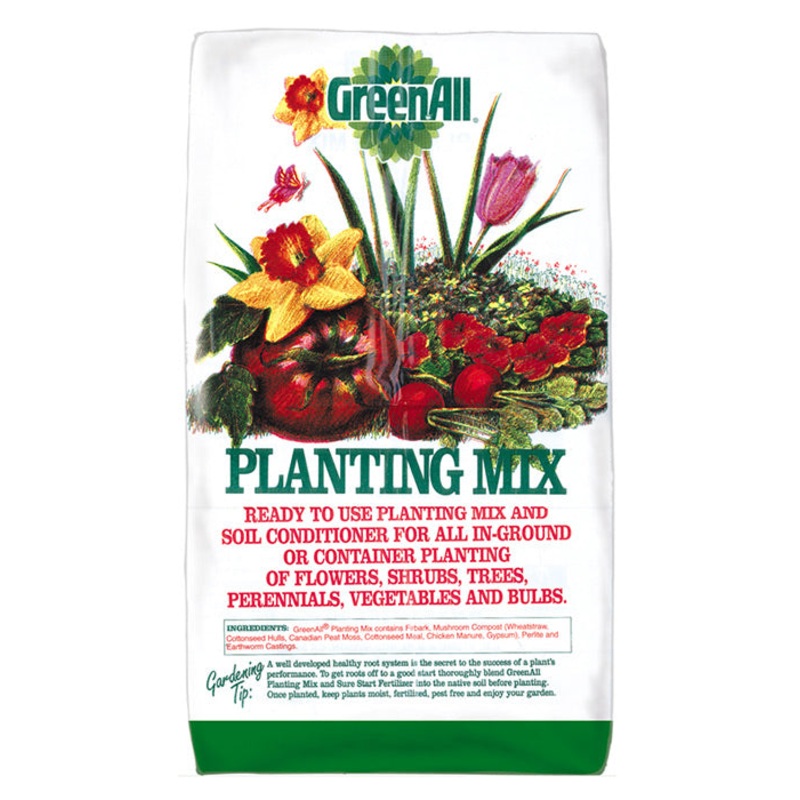 Green All Natural Planting mix All purpose ready-to-use planting mix. Mix with native soil or use it as it comes from the bag. Ingredients: Fir Bark, Perlite, Mushroom Compost, Earthworm Castings and a Wetting Agent.