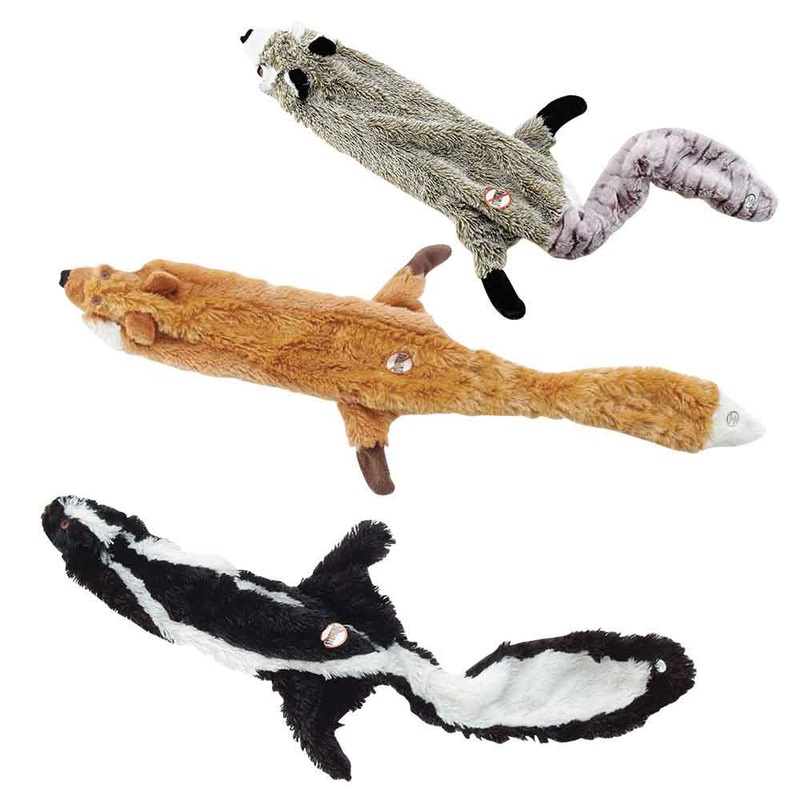 Skinneeez stuffing-free dog toys satisfy your dog's natural hunting instincts with floppng action. With no stuffing to rip out, you don't have to worry about cleaning up gobs of polyfill! These colorful critters offer long-lasting fur-flapping fun. Jumbo S