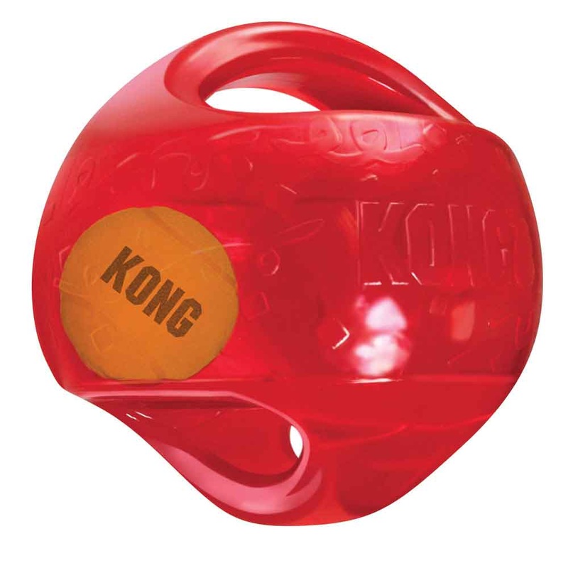 The KONG Jumbler is a two-in-one ball toy for twice the interactive fun. The interior tennis ball and loud squeak entice play, while the handles make pickup and shaking easy. The Jumbler stands up to tough play, making it ideal for games of fetch. Available in two shapes and sizes, the KONG Jumbler will ensure an exciting, active play session for you and your dog.\r\n