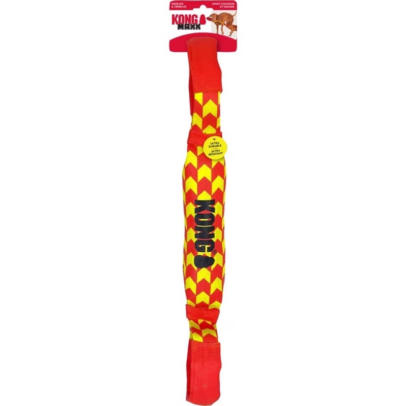 KONG MAXX Tug is rugged, durable, and made for energetic play sessions. This interactive tug toy is engineered for strength, with durable seatbelt material and two padded handles for extreme rounds of tugging, thrashing, and fetching. Inner crackle material and a squeaker keep dogs engaged for extended play sessions. Up to 5x stronger than typical plush toys, this tug is made for extreme fun.