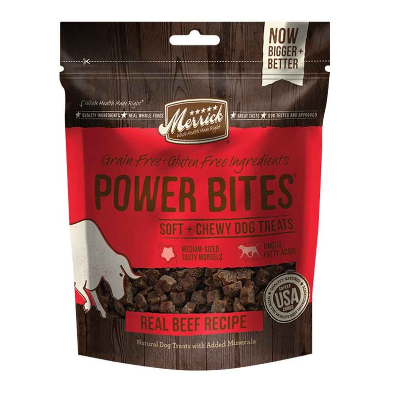 Merrick Power Bites are soft and chewy treats packed with protein and beef flavor. Great for every day snacks or