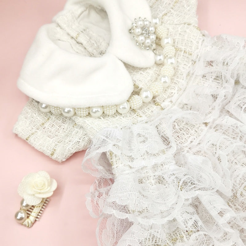 This designer Madmoiselle dog dress combines luxury and fashion for your pup. High quality materials make this dress comfortable and durable. The attached necklace and hair pin add a stylish flair to make your pup stand out. Treat your pup to the best-- Ma