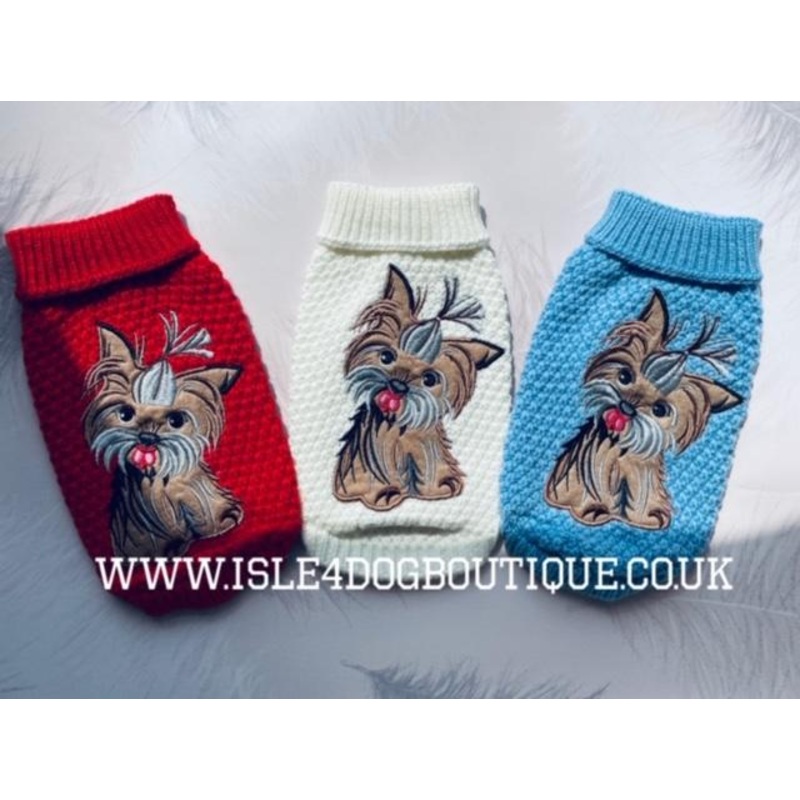 Dog knit jumper with Yorkie design.Size XXS 6" BACKSize XS 8" BACKSize S-10" BACKSize -M-12" BACKSize -L-14" BACKSize XL- 15/16" BACKSize XXL 17/18" BACKMake sure you measure your pet before purchase! We are specialised for small to medium breeds only! If