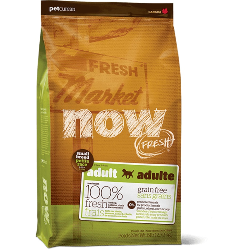 NOW FRESH SMALL BREEDGrain Free Small Breed Adult RecipeNOW FRESH Small Breed Adult Recipe is made with 100% FRESH turkey, salmon, duck, and 100% fresh Omega 3 & 6 oils from coconuts and canola. NOW FRESH also features zero grains, gluten, wheat, beef, cor