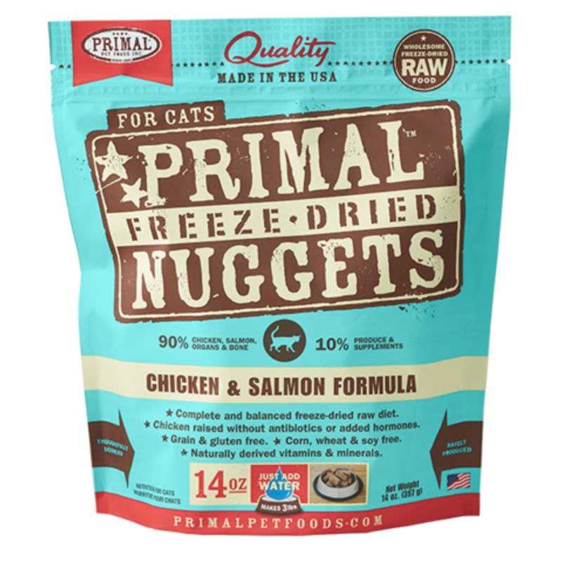RAW FREEZE-DRIED FELINE CHICKEN & SALMON FORMULAINGREDIENTS:Chicken, Chicken Necks, Chicken Gizzards, Salmon, Chicken Livers, Organic Kale, Organic Squash, Organic Carrots, Organic Apples, Organic Broccoli, Organic Cranberries, Organic Blueberries, Organic