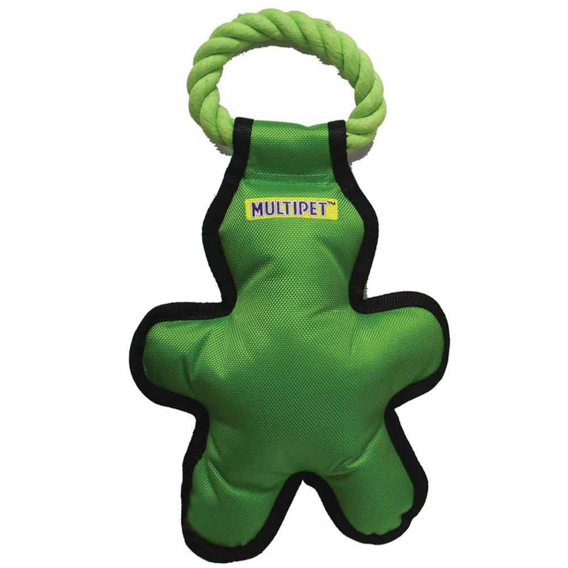 Multipet Tug ‘o Man with Rope dog toys have durable ‘ballistic’-style nylon toys that squeak, with cotton rope for tugging. Size 14 Assorted Colors.