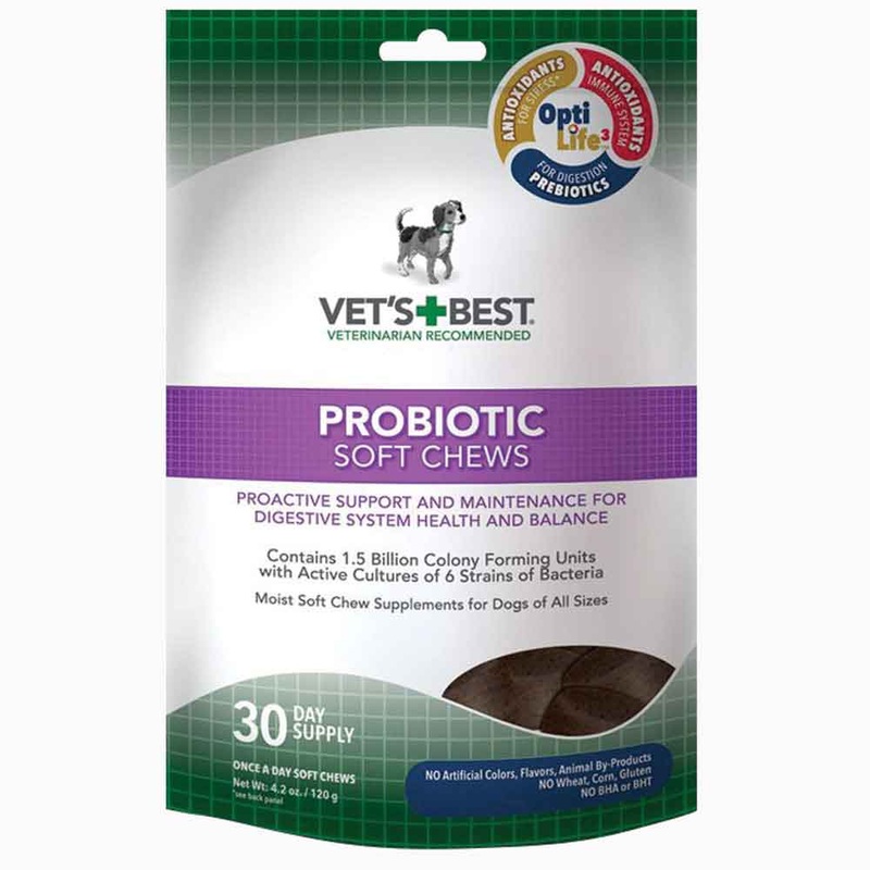 Maintain your dogs digestive health with Probiotic Soft Chews by Vets Best. This once a day supplement provides a stabilized source of bacteria to proactively maintain your dogs wellness through proper gastrointestinal balance which supports a normal healthy appetite with proper digestion. Each chew contains Bacillis Subtilis, and Bacillus Licheniformis, which are beneficial bacteria strains coated with patented technology to keep them stable until theyre in the digestive tract.