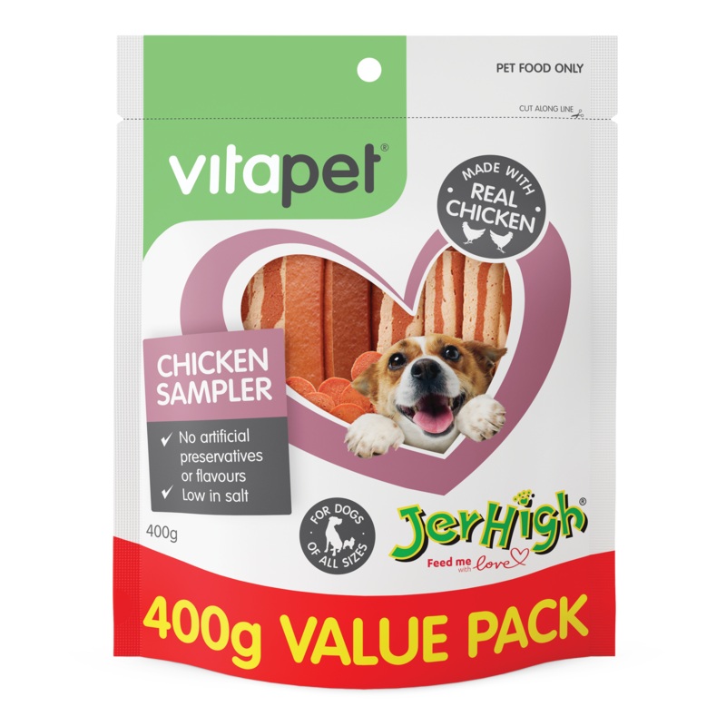 VitaPet - JerHigh Chicken Sampler Pack Dog Treat (400g) are slowly baked with love in a controlled environment to ensure all of the nourishing goodness is kept.Using simple honest ingredients with minimal processing allows us to give our best friend the be
