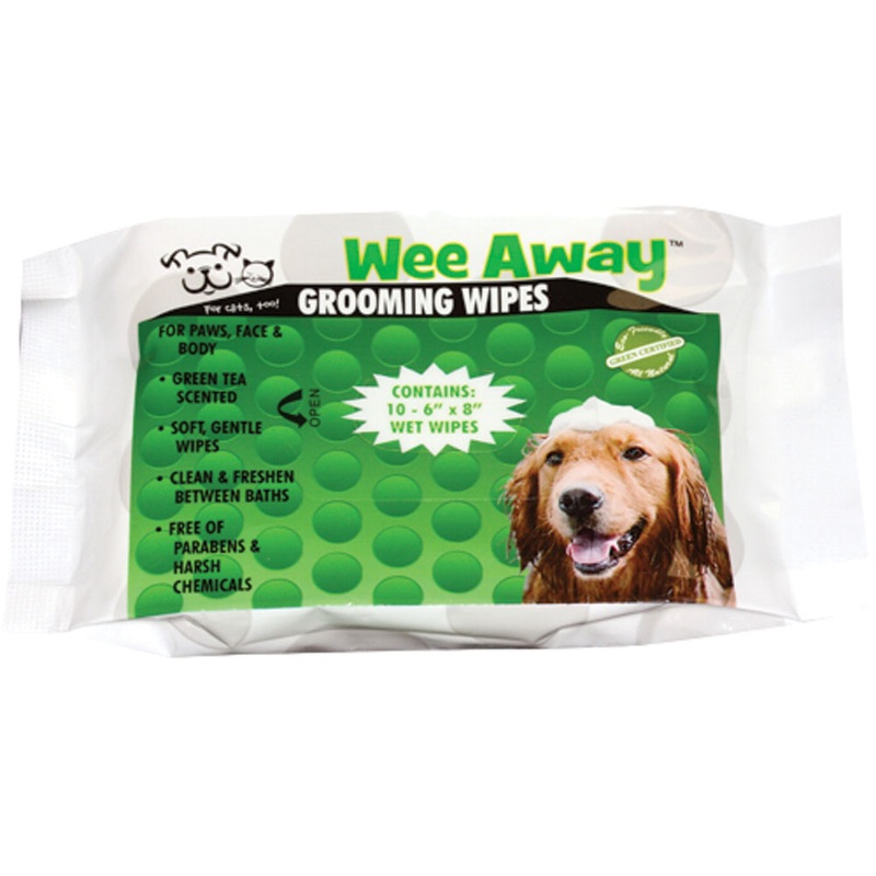 WEE AWAY Grooming Wipesare a safe and convenient way to help keep your pets face, paws and body fresh, clean and odor free in between baths. Gentle and non-irritating, these soft wipes contain natural, mild cleansers plus Chamomile and Calendula extracts and Aloe Vera to naturally soothe skin and coat.