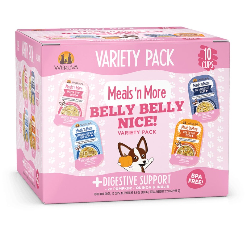 Dog and cat food are only available in our Lancaster, PA retail store or for local delivery.Weruva Belly Belly Nice! Variety Pack The Meals 'n More Belly Belly Nice!Variety Pack contains: (3) Amazon Livin' Recipe Plus, (3) Grandma's Chicken Soup Recipe Plu
