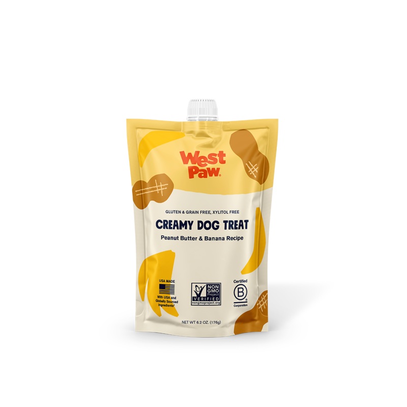 West Paw Creamy Dog Treat Peanut Butter & Banana 6.2ozCREAMY DOG TREATA healthy gourmet upgrade perfect for sneaking into treat toys, dressing up dinner, or rewarding the goodest boys and girls on the trail. Simple nutrition packed into a mess-free pouch f