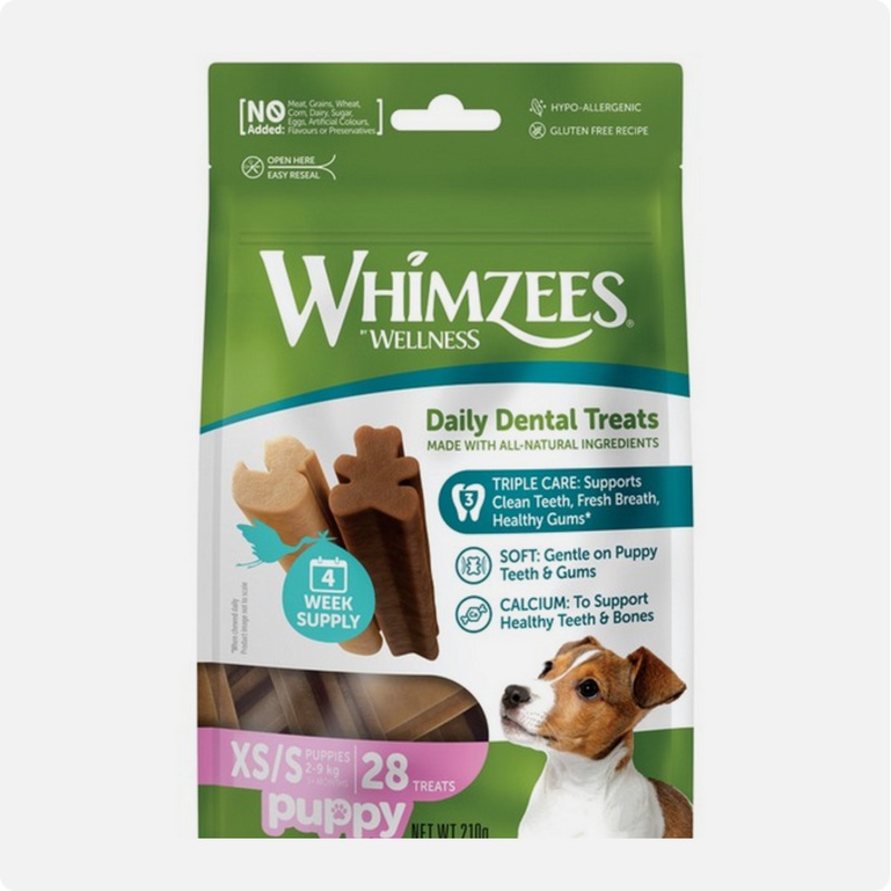 "Show your pup some love with WHIMZEES!WHIMZEES puppy treats are designed to help clean teeth and reduce plaque and tartar through your pups chewing action. A natural, healthy introduction to daily dental care, our puppy treats are softer than our adult WH