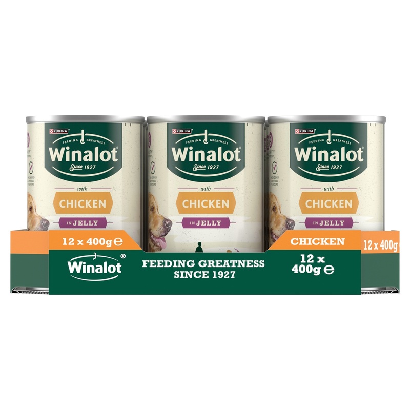 # WINALOT Classics Mixed in Jelly Chicken Wet Dog Food (12 x 400g) Give your furry friend the delicious and nutritious meal they deserve with WINALOT Classics Mixed in Jelly Chicken Wet Dog Food! This convenient pack of 12 x 400g cans provides a variety of tasty chicken recipes in a savory jelly that adult dogs will adore.## Key Benefits:* **100% Complete and Balanced:** Provides all the essential nutrients your dog needs for optimal health.* **No Added Colourants:** Made with wholesome ingredients and without artificial colors.* **Healthy Eyes and Skin:** Formulated to help maintain healthy eyes and a glossy coat.* **Strong Bones:** Supports strong and healthy bones for an active lifestyle.* **Vitality:** Helps maintain your dog’s energy levels and overall vitality.## Product Highlights:* ** Complete Pet Food for Adult Dogs:** Specifically formulated to meet the nutritional needs of adult dogs.* ** Delicious Chicken Flavors:** A variety of chicken recipes in a tasty jelly your dog will love.* ** Convenient Pack:** Contains 12 x 400g cans for easy feeding and storage.* ** Quality Ingredients:** Made with high-quality ingredients for a nutritious and satisfying meal.Treat your dog to the goodness of WINALOT Classics!