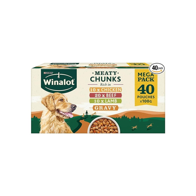 WINALOT Adult WetDog Food Mixed in Gravy with Chicken, Lamb, Beef 40 x 100g Pouches Pack Includes: 10 x Chicken with Carrots; 20 x Beef with...
