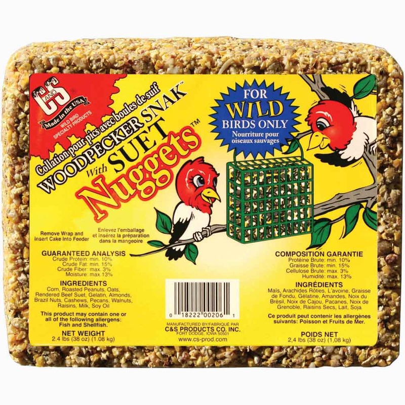 Give the birds what they want. Woodpecker Snak with Suet Nuggets provides wild birds tempting flavor and the nutrition required to keep their little bodies in shape. The unique formulation combines the finest in seed, nuts and fruits. Made In The USA.Ingre