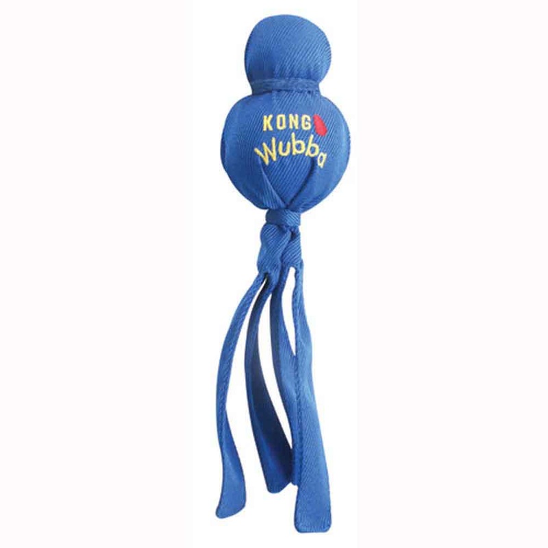 The KONG Wubba is a fun, interactive toss and tug toy. Durable reinforced nylon fabric covers two balls - a tennis ball on top and a squeaker ball beneath. The long tails make it easy to pick up and throw. Dogs love to squeak the Wubba and shake the flappi