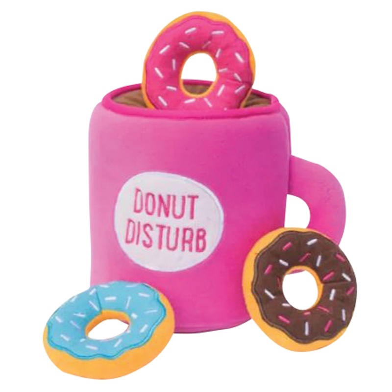 Mmm Zippy Burrow Coffee and Donutz! Simply dunk the donuts into the mug and Donut Disturb the doggo until they have dug them all out! Once your playful pup has them all out, theyll be begging you to put them back in again and again for hours of fun! Its the perfect interactive toy for keeping your dog busy and engaged through hide-and-seek play that prevents boredom and promotes mental stimulation! This interactive hide-and-seek toy comes with 1 coffee mug and 3 small squeaky donuts. Burrow size: 6 x 8 x 6 in