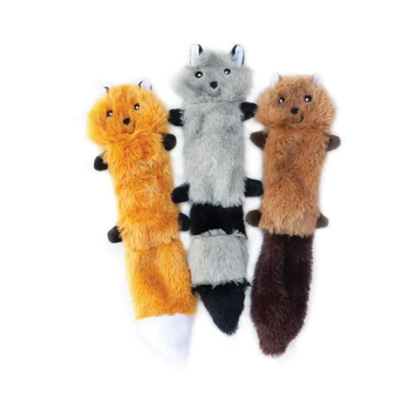ZippyPaws Skinny Peltz are no-stuffing plush dog toys that provide hours of squeaking fun! This set includes 3 small toys (1 of each: Fox, Raccoon, and Squirrel). Each toy includes 3 small round squeakers. Ideal for small dogs.